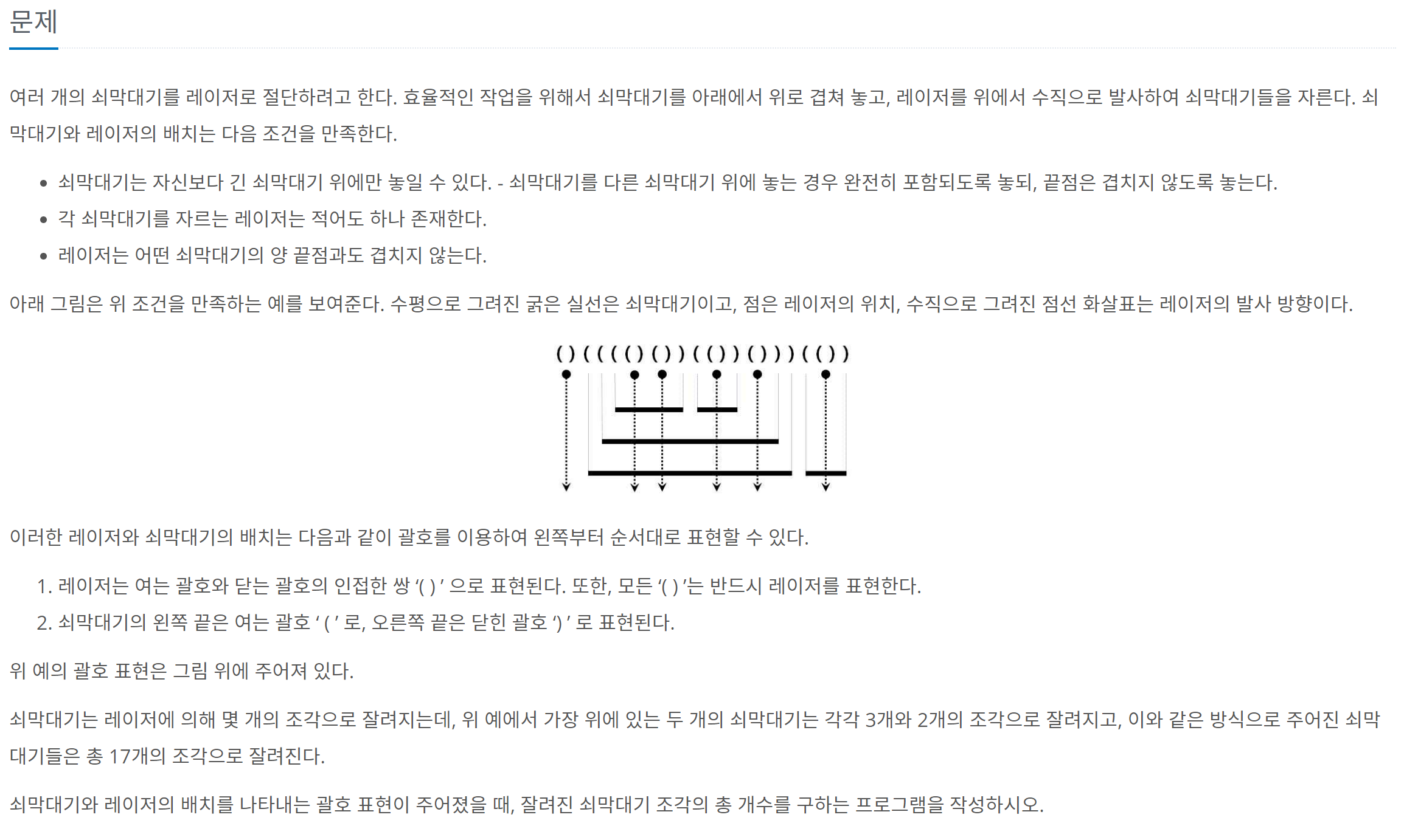 괄호가 ()한번에 닫히면 레이저, 나중에 닫히면 막대의 끝부분임을 알 수 있고, 레이저는 현재의 막대기 개수만큼 자른다는 사실을 통해 정답을 구할 수 있습니다.