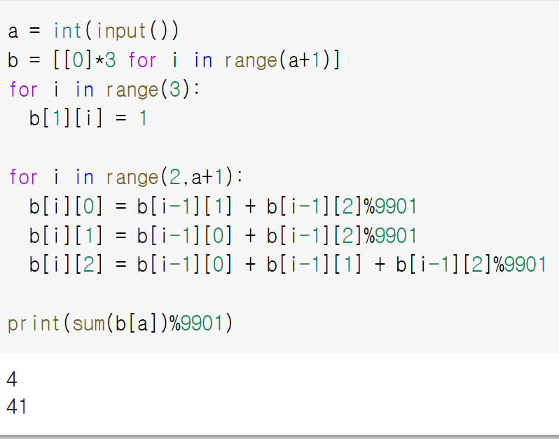 3. b[i-1][2]는 비어두기 값인데, 메모리가 초과되서 가장 큰 b[i-1][2](비어두기)를 9901나머지 값으로 바꿔준다.
