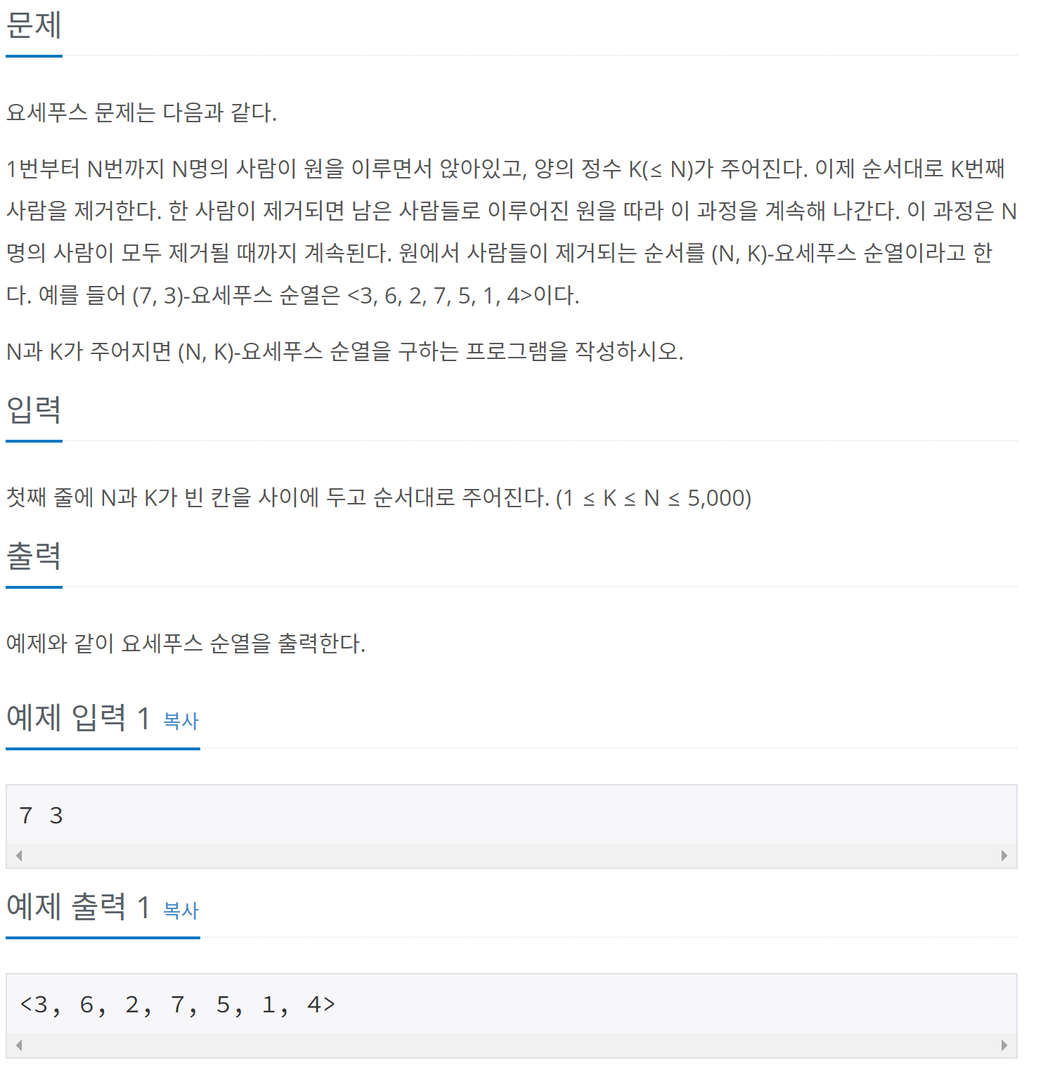 <3, 6, 2, 7, 5, 1, 4>로 출력하라고 했기 때문이다.